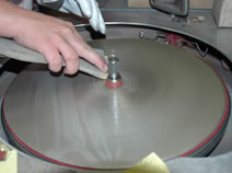 De achterkant van de stempel moet absoluut vlak en glad zijn – vrij van onvolkomenheden die de kwaliteit van de pers zouden kunnen aantasten. De stempel wordt op een speciaal roterend wielapparaat geplaatst en handmatig met de hand geschuurd met verschillende kwaliteiten (van grof tot fijn) schuurpapier dat de achterkant van de stempel fijn polijst. Op de voorkant van de stempel wordt een zacht fluwelen kussen aangebracht om beschadiging van het gegroefde oppervlak te voorkomen.