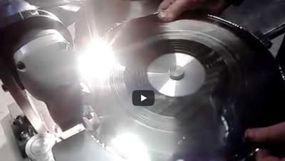 De randen van de stempel moeten worden bijgesneden om te passen bij de vereiste diameter van het uiteindelijke formaat van de plaat – die van formaat tot formaat kan verschillen. De stempel wordt bevestigd aan een snijmachine bestaande uit een roterende schijf met een snijmes, en wordt gesneden op de sjabloonafmetingen van 320 mm, 265 mm of 192 mm. De scherpe randen van de stempel worden vervolgens handmatig gepolijst.
