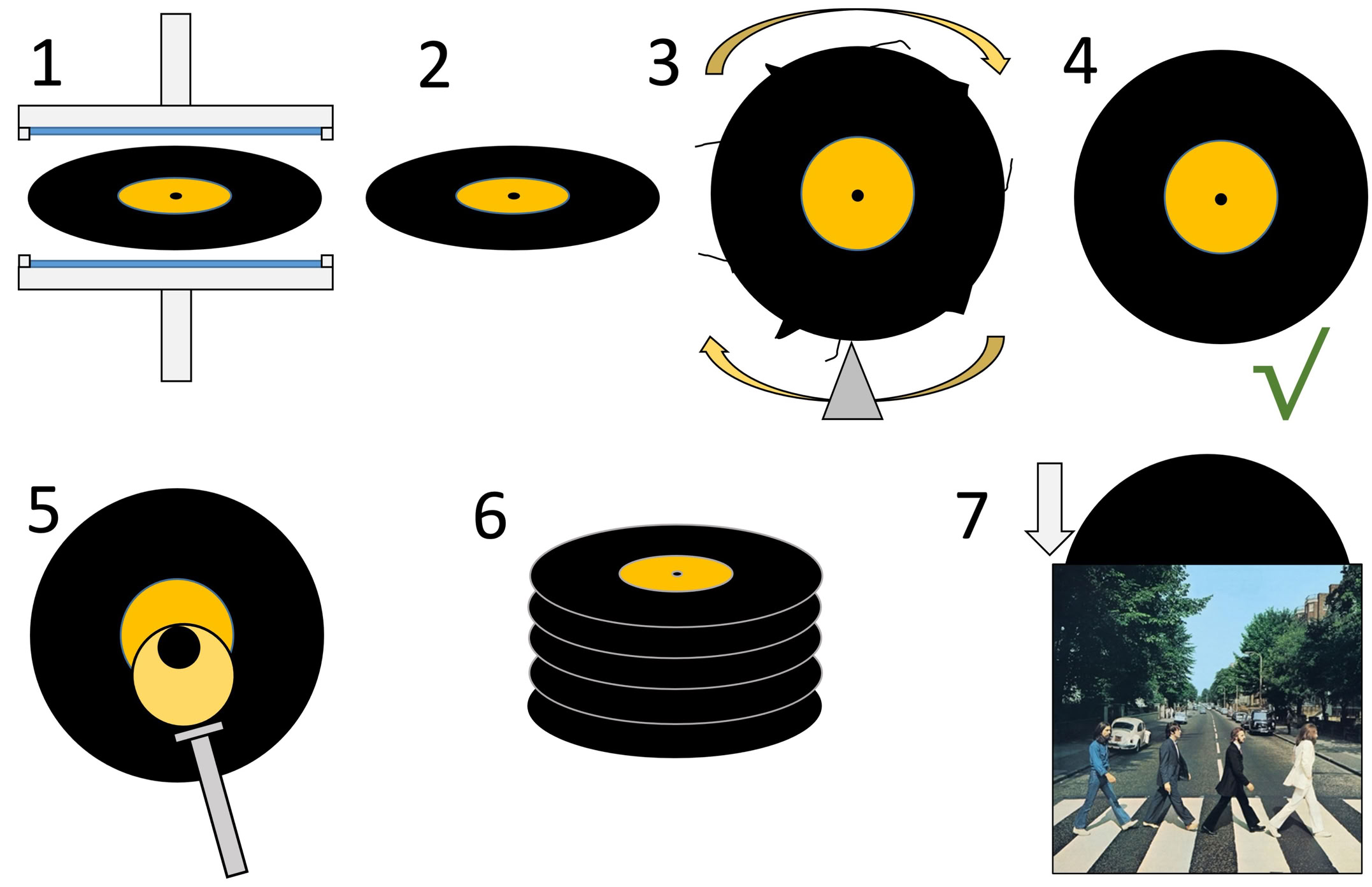 Het overtollige vinyl wordt afgesneden door de elpee langs een snijvlak rond te draaien. Hierdoor wordt de elpee perfect rond en kan het afgesneden vinyl worden teruggewonnen. Dit is te zien in afbeeldingen 3 en 4.